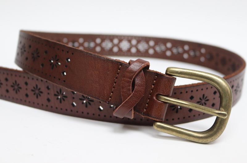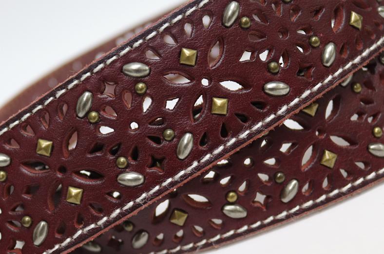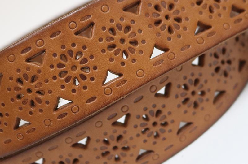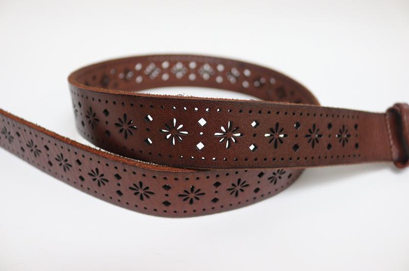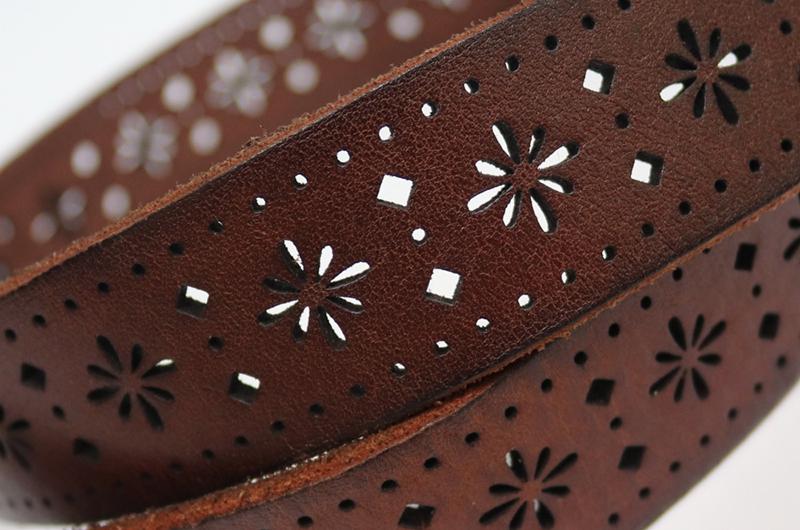 МатериалыКак правило, для ажурных ремней главным образом используется кожа. Ажурный кожаный ремень из-за его тяжелого веса имеет только один слой, в отличие от ремней из искуственной кожи PU, требующих несколько слоев.Следовательно, после перфорации, внутренний цвет остается полностью равномерным.